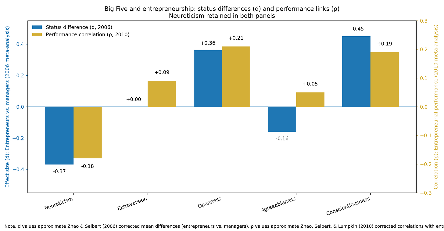 A classic meta-analysis here is Zhao and Seibert (2006), which compared entrepreneurs to managers on the Big Five personality traits. Entrepreneurs are higher in Conscientiousness and Openness, and lower in Neuroticism and Agreeableness. There is no reliable difference in Extraversion. The effect sizes are not enormous, but the profile is consistent, and the overall multivariate association between the Big Five and entrepreneurial status is moderate.